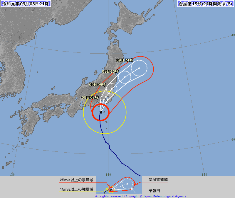 強い台風15号が首都圏に接近している。強い勢力を維持したまま、8日夜遅くから9日明け方には関東地方または静岡県に上陸、9日昼前にかけて関東甲信地方を通過する見込みだ。