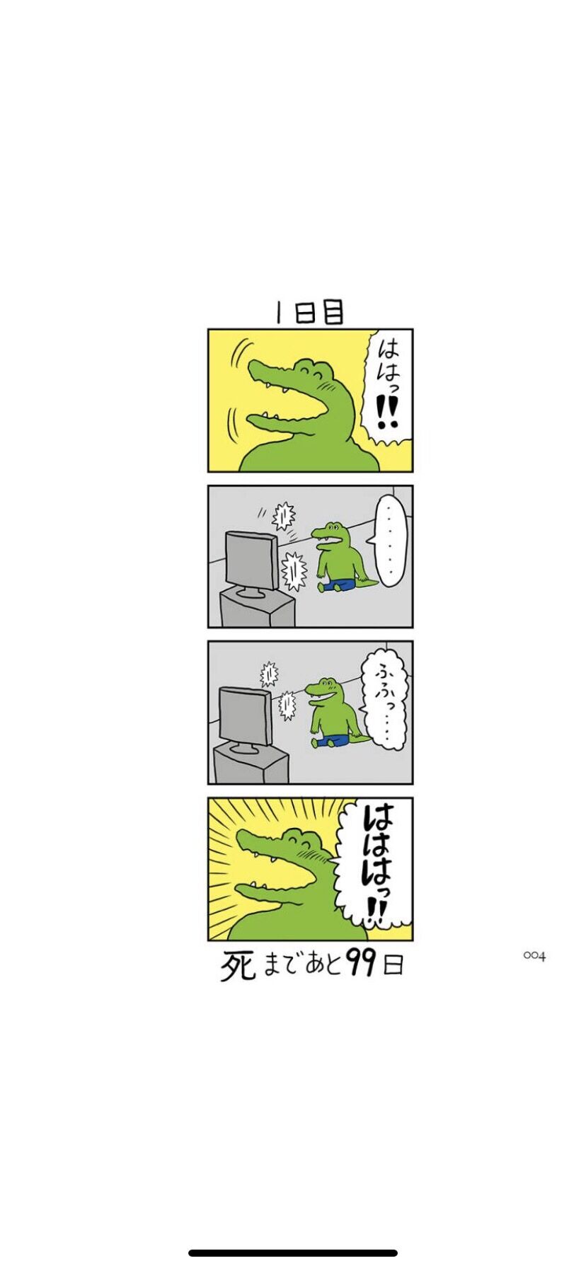| 『100日後に死ぬワニ』(ひゃくにちごにしぬワニ)は、きくちゆうきの日本の4コマ漫画。コマの枠外で「死まであと○日」と明示された作中のワニの100日間を、4コマ(最終話は大コマも含めて13コマ)を1日としたカウントダウン形式で描く。2019年12月12日から作者自身のTwitterアカウントで公開が 28キロバイト (4,106 語) - 2020年4月8日 (水) 14:12 |