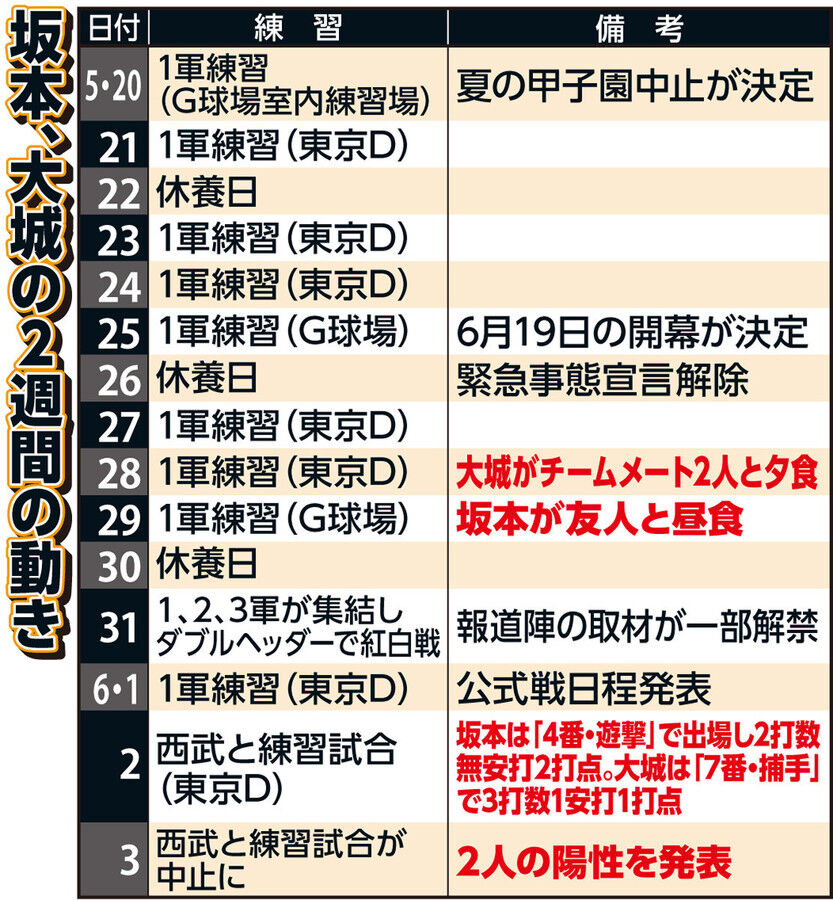 坂本と大城は入院し、今後連日受けるPCR検査で陰性が確認され次第すみやかに合流する、と球団は説明した。
