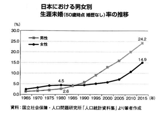 直近の2015年国勢調査では、男性の生涯未婚率は24.2%、女性は14.9%となっています。表現を変えるならば、「日本の50歳男性の約4人に1人は一度も結婚経験がない」という状況です。これに対して女性は約7人に1人ですので、両者の生涯未婚率には大きな開きがあることがわかります。