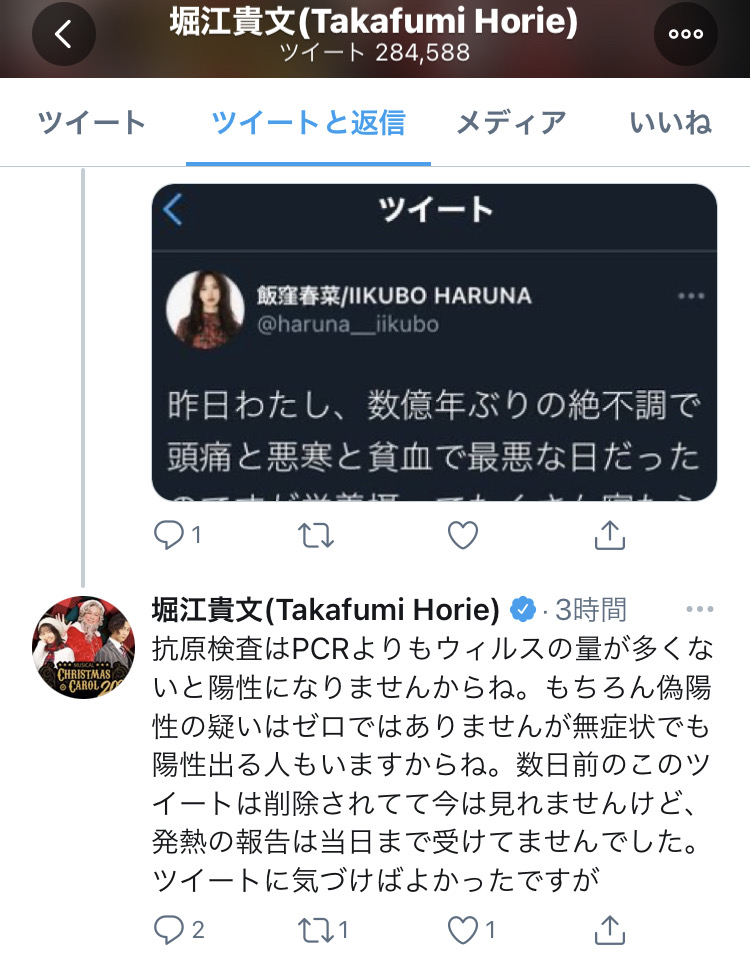 《9日に数億年ぶりの頭痛・悪寒・貧血で体調不良だったのを薬飲んで治したってツイートしてるんですよね。それってコロナの初期症状だよね。なのに舞台稽古終わりにぎゅうぎゅう詰めで会食してるインスタも投稿してるし、なんだかなぁ》