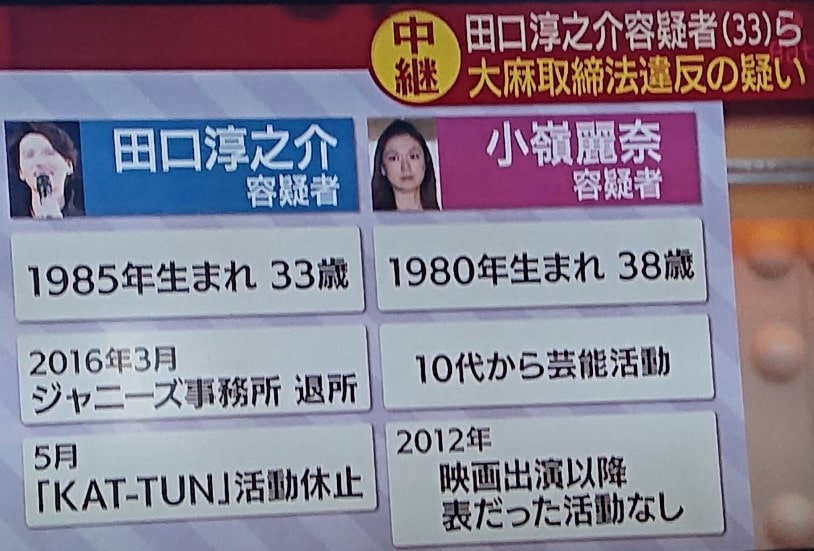 田口淳之介と恋人の小嶺麗奈を大麻取締法違反容疑で逮捕